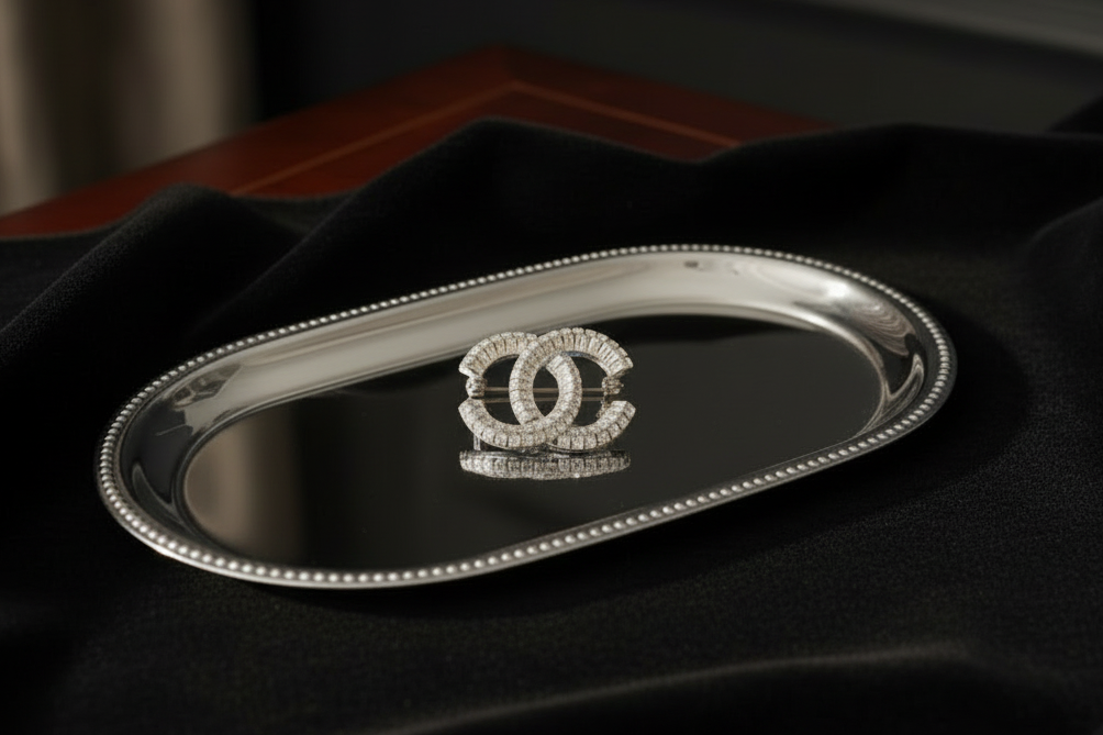 Make a dazzling statement with this stunning designer inspired Canna brooch featuring brilliant baguette-cut crystals in silver finish. This iconic interlocking C design embodies the epitome of luxury and refinement.