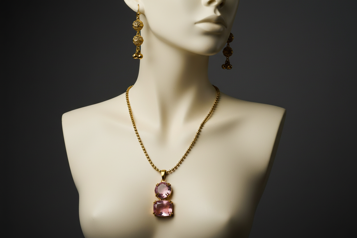 This Moonflower Pendant Set features premium doublet/hydro stones in vibrant colors, complemented by an antique gold finish. The traditional mug mala chain adds a unique touch, making it a great fusion set. Elevate your style with expertly-crafted jewelry that combines classic elements with modern design.