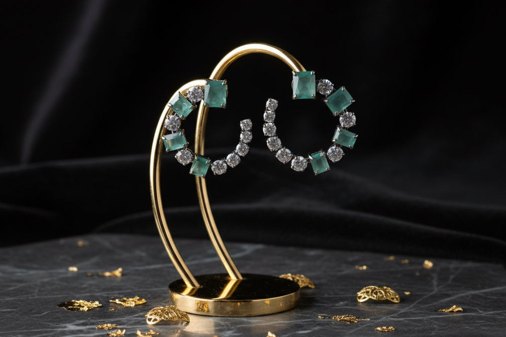 The Rosin Earrings feature a mint doublet stone, complemented by American diamonds, crafted in a circular shape for an elegant fit.