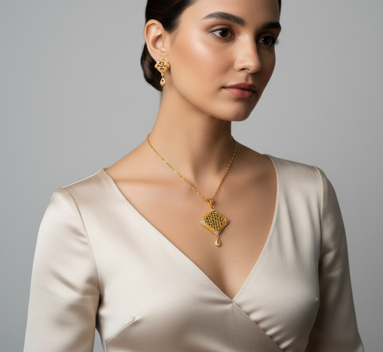 Expertly crafted with the finest materials, the Slane Pendent Set mimics the luxurious look of real gold. Each piece is intricately gold plated and adorned with stunning Swarovski Crystals. Elevate any outfit with this exquisite and timeless set.